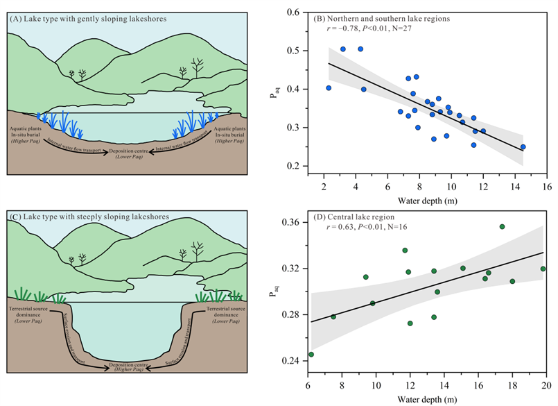 针对上述问题,中国科学院南京地理与湖泊研究所湖泊沉积与全球变化研究团队提出湖泊水下地形调控正构烷烃Paq指标与水位之间关系的假说。选择云南洱海作为验证上述假说的理想湖泊,主要因为其水下地形具有北部和南部湖盆较平缓、中部湖盆较陡峭的特点。通过系统调查洱海的陆生和水生植被、湖泊沉积物中正构烷烃的组成与空间分布特征,发现湖泊表层长链和中链正构烷烃分别来自河流搬运和水生植物原地埋藏,同时,全湖湖泊表层沉积物样品的Paq指标与湖泊水位关系较差,表明水下地形在变化情况下,Paq指标与水位的关系较复杂。进一步将数据拆分为北部和南部区域(缓坡型),和中部区域(陡坡型),Paq指标与湖泊水位相关关系显著提升,但呈现两种相反的相关性结果(图1),上述结果证实了湖泊水下地形调控正构烷烃指标古水位解译的假说。