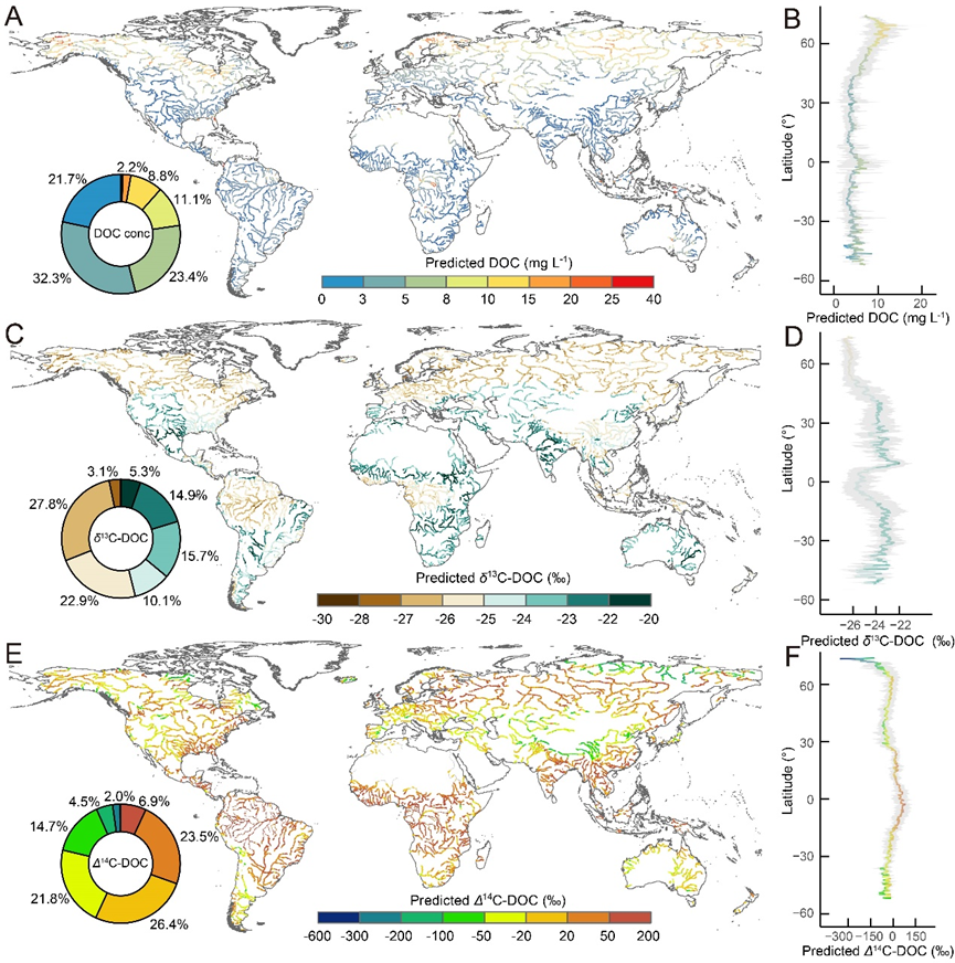 图1. 预测的全球河流溶解性有机碳(DOC)浓度及其δ¹³C和Δ¹⁴C值的空间分布与纬向变化特征
