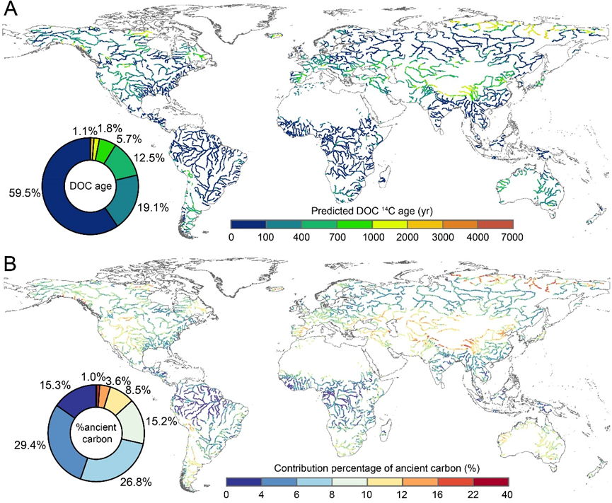 图2. 全球河流DOC的¹⁴C年龄预测及古老碳对河流DOC库贡献比例