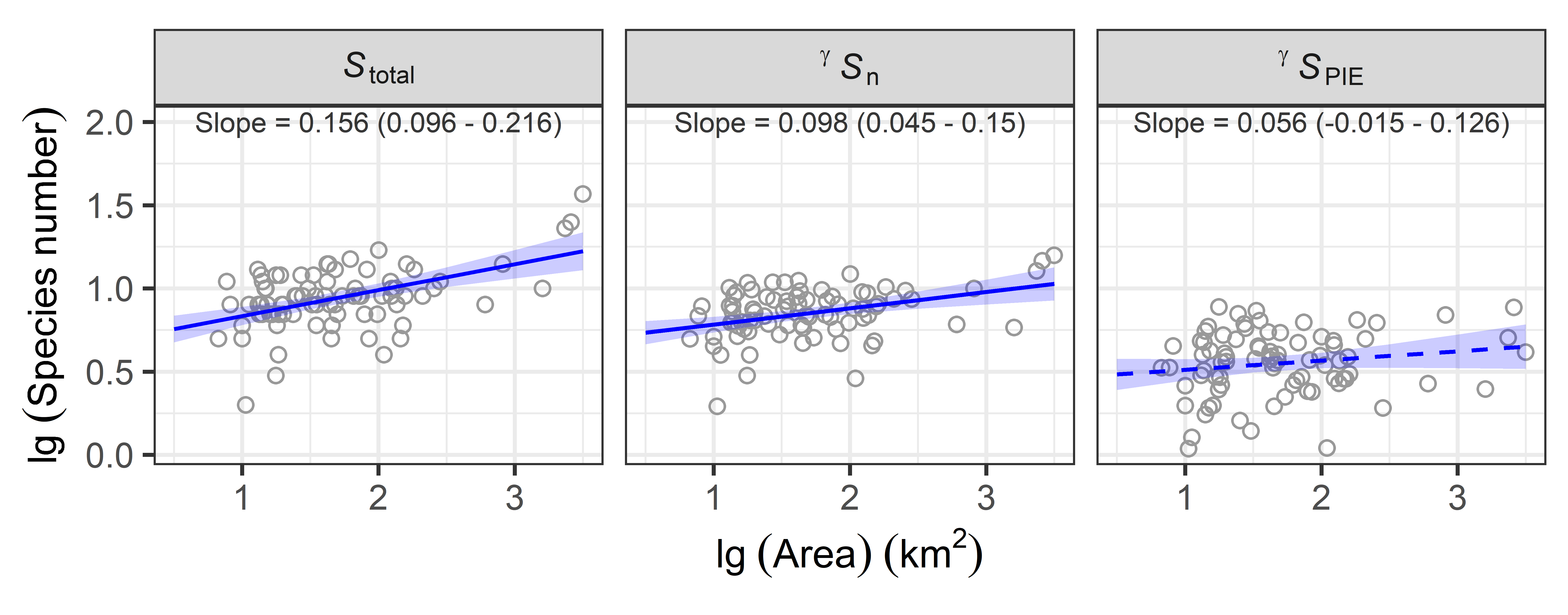 图2. 长江中下游浅水湖泊面积与总物种数、相同个体下的物种数、相同个体下的优势物种数之间的对数关系