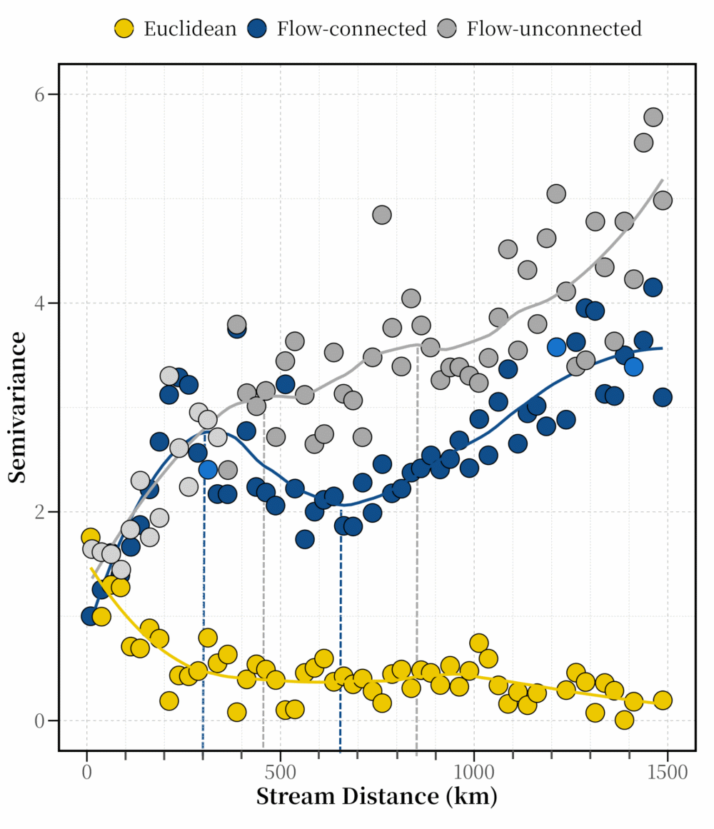 图2.基于流连通(灰色)、流非连通(蓝色)和欧氏距离(黄色)三种空间关系的长江流域河流水体δ¹⁸O半方差函数