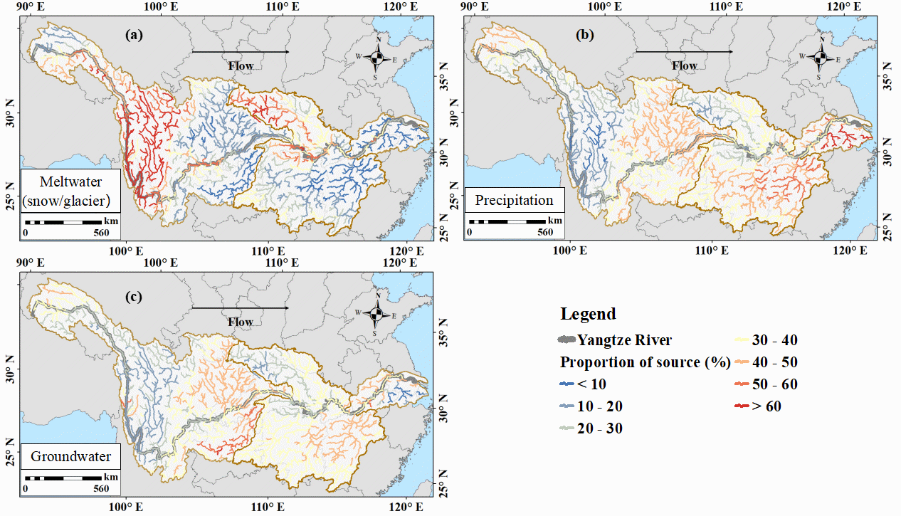 图4.长江流域沿河网估算的(a)融水、(b)降水、(c)地下水相对贡献率(%)的空间变化