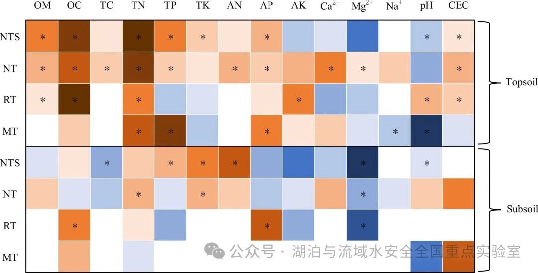 图2. 与传统耕作方式相比,不同深度下各种保护性耕作方式导致的土壤属性变化。橙色和蓝色分别表示正效应和负效应;颜色越深表明效应越强,“*”表示通过显著性检验。