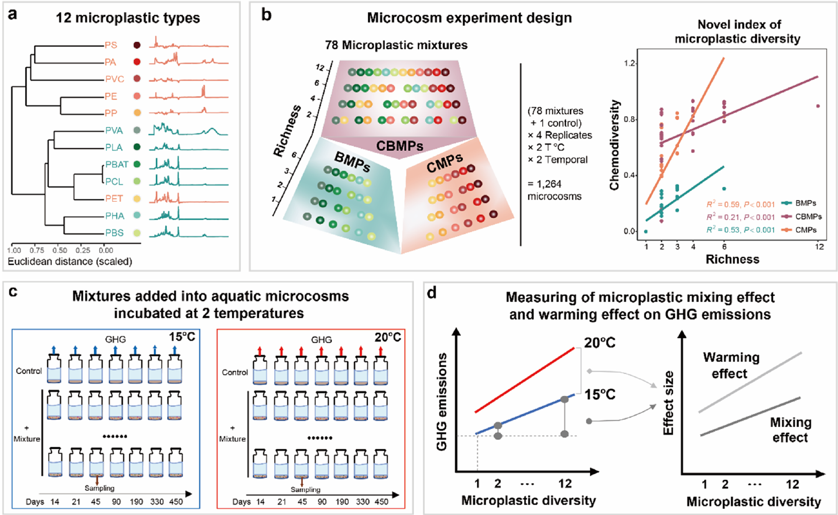 针对上述科学问题,中国科学院南京地理与湖泊研究所王建军研究员团队,以太湖沉积物为研究对象,通过构建1264个水生微宇宙体系,系统探究了微塑料多样性与气候变暖对温室气体排放的综合效应(图1)。研究选取全球淡水环境中常见的12种微塑料(6种传统型如聚丙烯、聚乙烯,6种生物可降解型如聚乳酸、聚羟基脂肪酸酯),设计78种混合物,形成 1至12 种的多样性梯度,涵盖三种混合策略,即仅传统微塑料、仅生物可降解微塑料、以及两者混合,并创新微塑料化学多样性指数。微宇宙体系模拟温度变化情景(15oC和20oC),开展长达450天的培养,监测温室气体排放动态,结合微生物群落分析、溶解有机质表征等手段进行作用机制的综合解析。