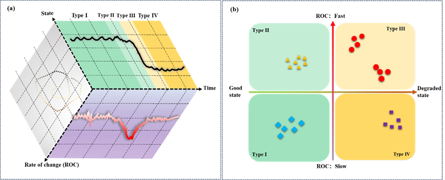 图1. a. 概念示意图展示了生态系统状态与变化速率随时间变化的关系。b. 根据图 a 所示的动态轨迹(状态–变化速率关系),生态系统可分为四种类型:I 型表现为低变化速率且生态状态良好;II 型变化速率增加但生态状态相对良好;III 型具有高变化速率且生态状态较差;IV 型则表现为低变化速率但生态状态很差