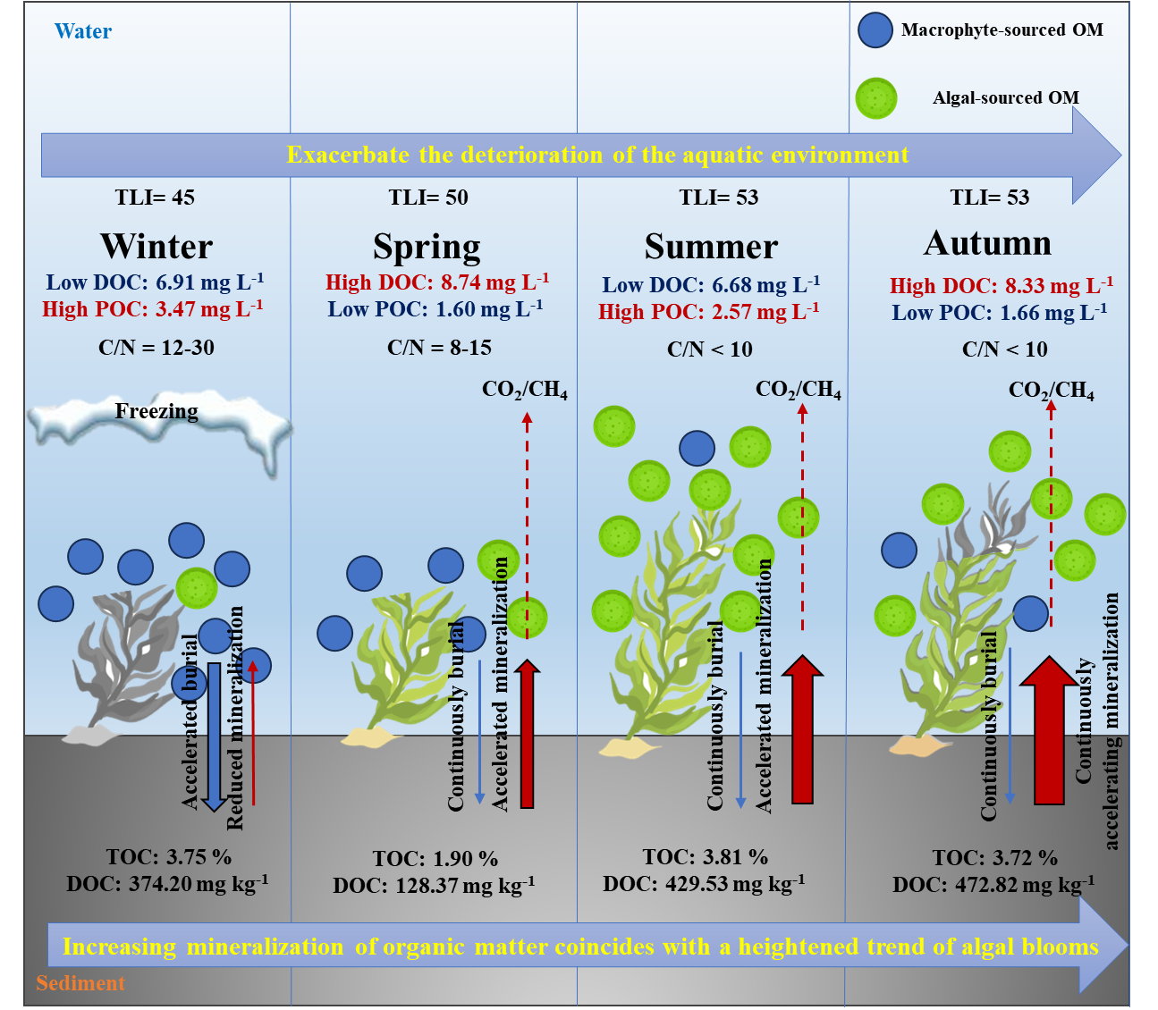 研究结果显示,乌梁素海的有机质埋藏相比于亚热带富营养化湖泊明显更高,在冬季达到峰值,而矿化主要发生在春季、夏季和秋季。夏季沉积物中藻源有机质的积累和水中藻源有机质的快速降解表明藻华呈上升趋势,从而进一步加速了有机质矿化过程。在全球变化不断加剧背景下,乌梁素海流域每年增温速度约为0.08℃。该区域的变暖趋势可能会通过更早的冰雪融化和更高的季节性温度加剧沉积物中埋藏有机质的矿化。这些过程进而可能会增加碳排放,并促进湖泊向藻类主导的浑浊状态过渡。未来的研究应更多地关注类似寒旱区草型富营养化草型湖泊有机质的循环过程。