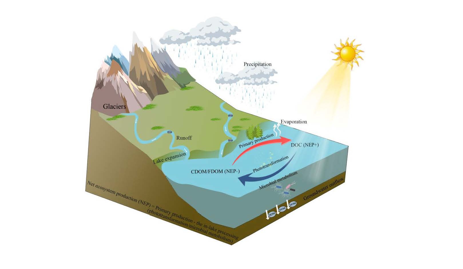 湖泊在全球碳循环中扮演重要角色,青藏高原地区是全球气候变化最为敏感的地区之一,该地区湖泊碳循环变化尤为值得关注。气候变化影响下,青藏高原湖泊的有机碳输入和转化过程正在经历如下变化:冰川消融与冻土融化增加了外源性溶解性有机质(DOM)的通量,气温升高促进内源DOM的产生;另一方面,气温升高和湖泊透明度增加有利于DOM在湖泊中的转化。截至目前,气候变化引发的青藏高原湖泊DOM来源和转化改变如何影响湖水溶解性有机碳(DOC)储量及其机制尚缺乏系统阐释。