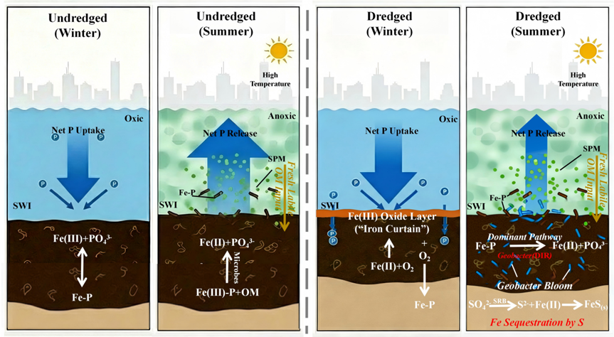 针对这一科学问题,中国科学院南京地理与湖泊研究所钟继承副研究员研究小组以典型城市富营养化湖泊——玄武湖为研究对象,综合运用高分辨率薄膜扩散梯度技术(DGT)与微生物组学等技术,开展了为期近一年的湖泊原位模拟疏浚研究。研究结果表明,疏浚总体上能够削减沉积物磷释放,并促使沉积物磷库从易迁移向更稳定形态转变,体现出一定的固磷效应。然而,这种改善效应受季节性环境变化调控:在夏季高温缺氧条件下,疏浚沉积物出现磷释放反弹。在机制上,疏浚后沉积物磷主控过程由 Fe–S 协同调控转向以铁循环为主导,伴随铁还原相关微生物(如 Geobacter)增强,削弱了铁对磷的稳定固定并促进再释放。同时,回淤过程(如富磷悬浮颗粒物的再沉降)可持续补给活性磷源,会加快疏浚后界面生物地球化学过程的恢复从而削弱疏浚效益。上述发现表明,疏浚并非一次性工程措施,需针对关键季节窗口开展持续监测与配套管理以延长疏浚环境效益。相关成果近期发表在Water Research期刊上。