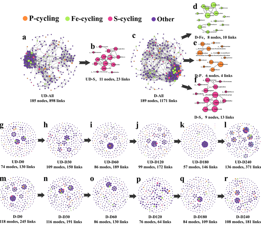 图2. 疏浚及对照微生物群落功能网络的重组与演替过程(Fe–S–P相关类群)
