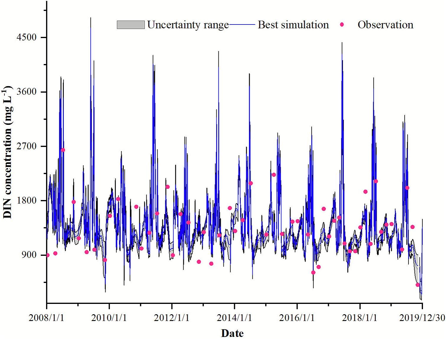 图1. 宜丰河流域河流无机氮浓度动态模拟结果及预测不确定性