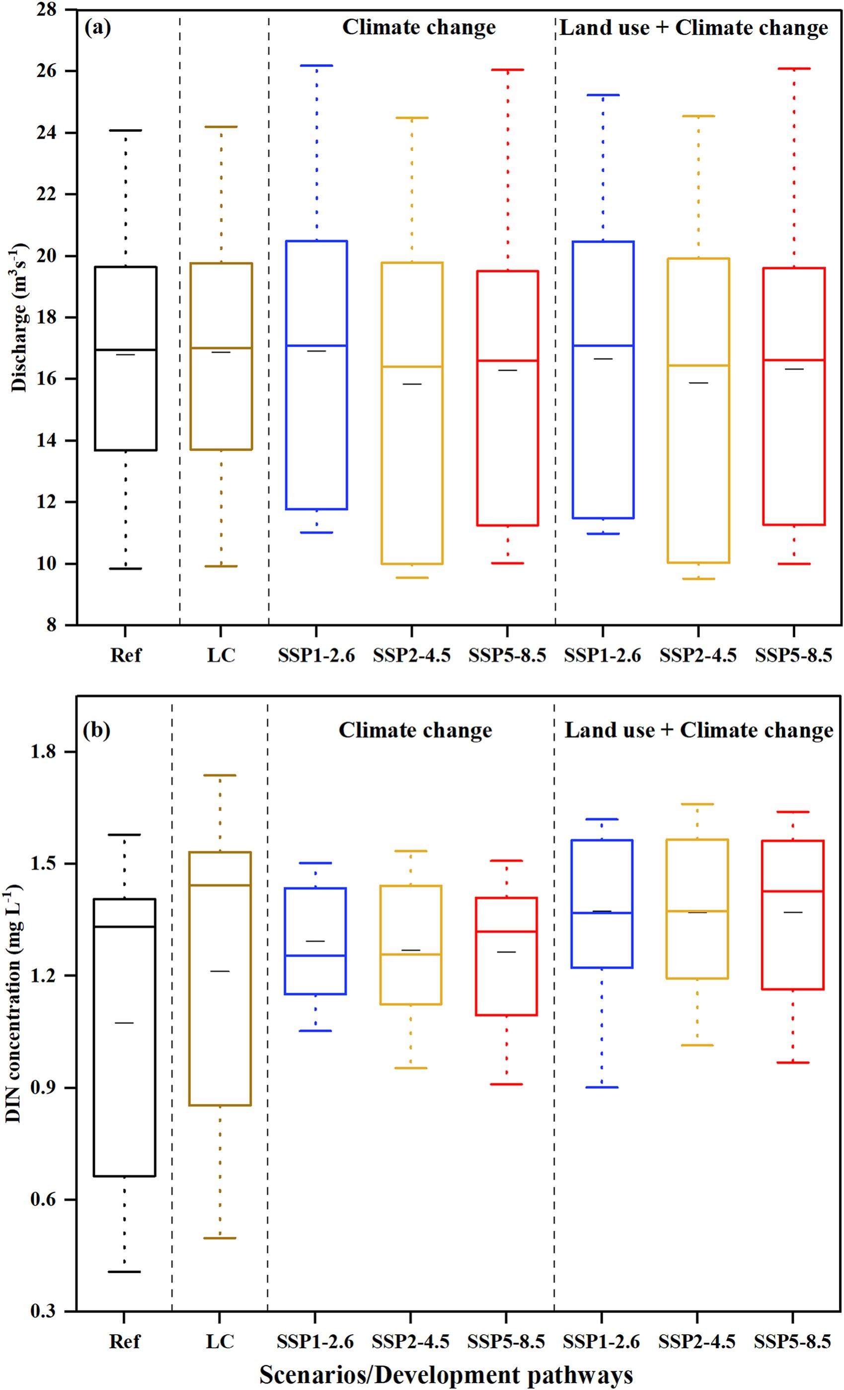 图3. 气候变化和土地利用改变影响下宜丰河流域平均流量与河流无机氮浓度变异性