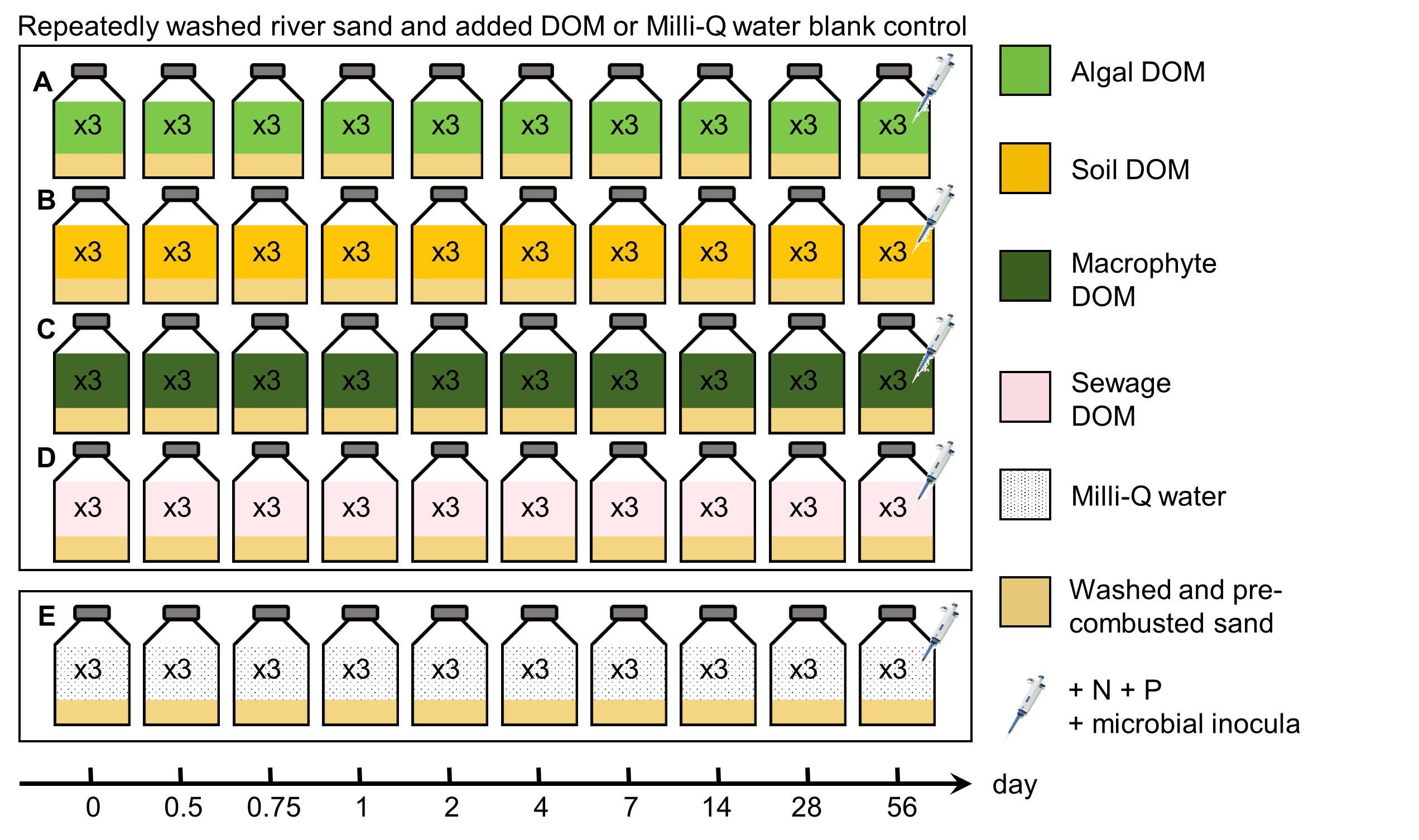 图1. 实验方案(所有处理组均设置10个时间点× 3个重复,n = 150)。玻璃瓶底部填充约3 cm厚的经反复清洗并预先灼烧的河流细沙,随后加入80 mL不同来源的DOM样品,包括(A)藻类来源、(B)土壤来源、(C)水生植物来源和(D)污水来源的浸出液。由于细沙的多孔结构,沉积层上方的有效水体积约为 60 mL。此外,向瓶中添加Milli-Q水作为空白对照(E)。