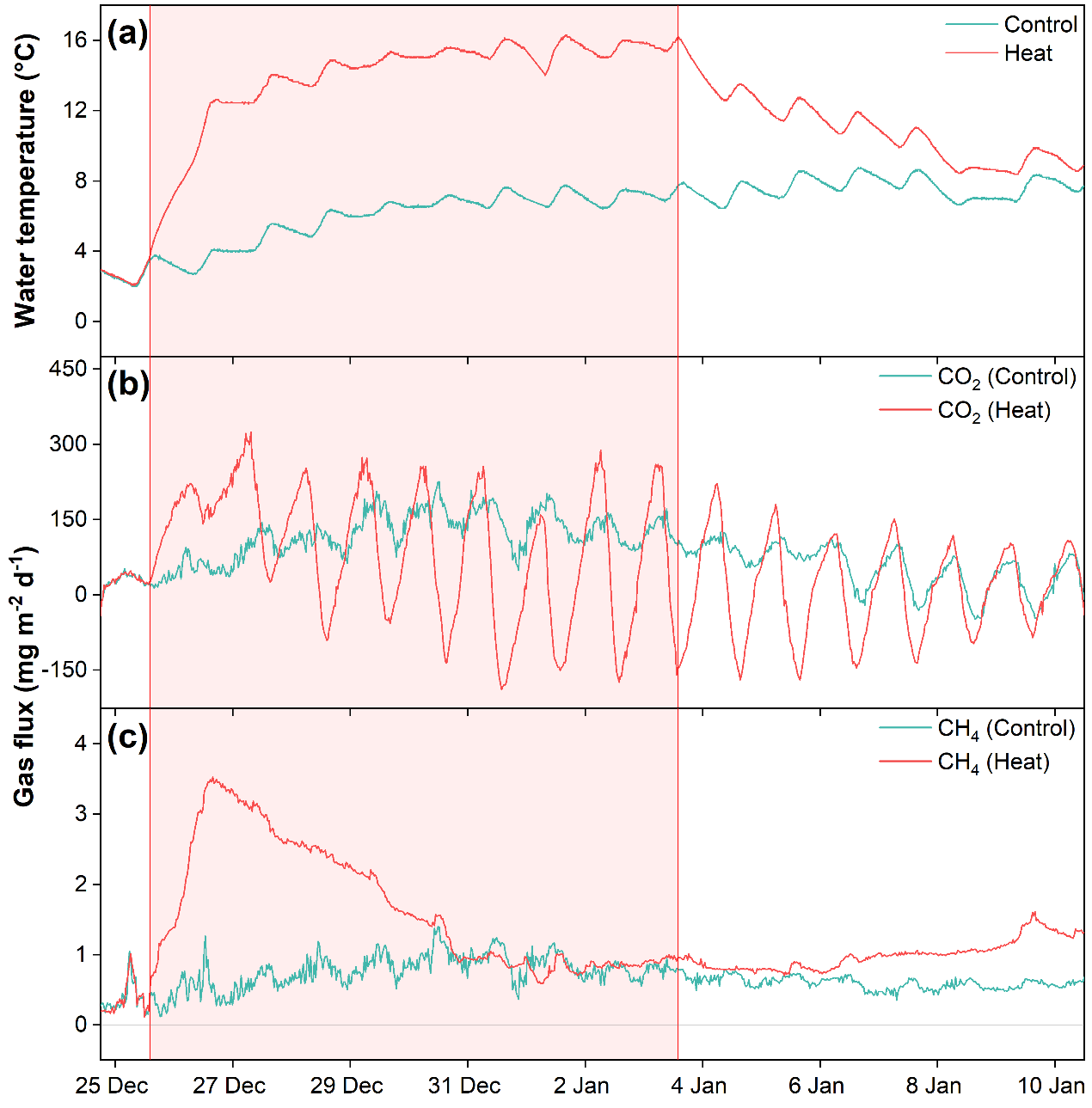 针对上述科学问题,中国科学院南京地理与湖泊研究所全球变化湖沼学研究小组基于太湖历史冬季热浪记录,依托智慧湖泊模拟系统(Smart Ecolake),在冬季开展了有关热浪效应的中宇宙模拟研究,以定量分析冬季热浪情景下CO2和CH4排放的时间动态及其驱动机制。