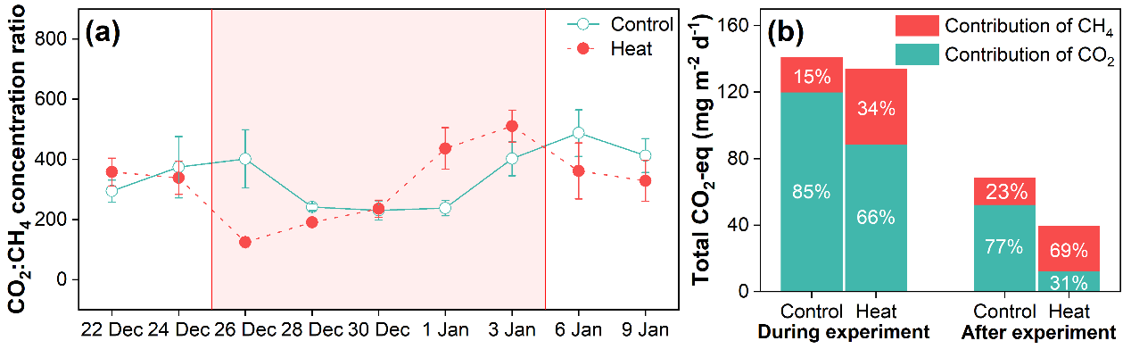 图2 (a)对照组和热浪组CO2: CH4浓度比值变化和(b)总CO2-eq的变化,红色区域代表热浪发生的时期。