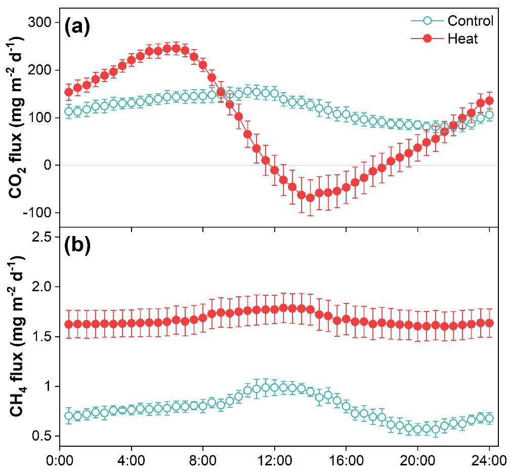 图3 对照组和热浪组在热浪发生期间(a)CO2通量和(b)CH4通量的日变化。