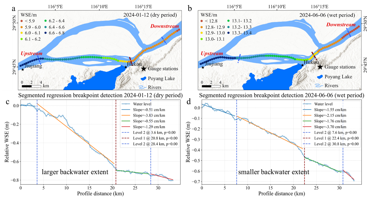 在枯水季(如2024年1月),自湖口向上游约17.2 km范围内,干流水面坡度受到显著“抬升”,显示出典型的湖补河江“回水效应”;同时,下游约7.6 km内也检测到可辨识的水动力信号,说明湖水对长江下游局部河段亦有调节作用。