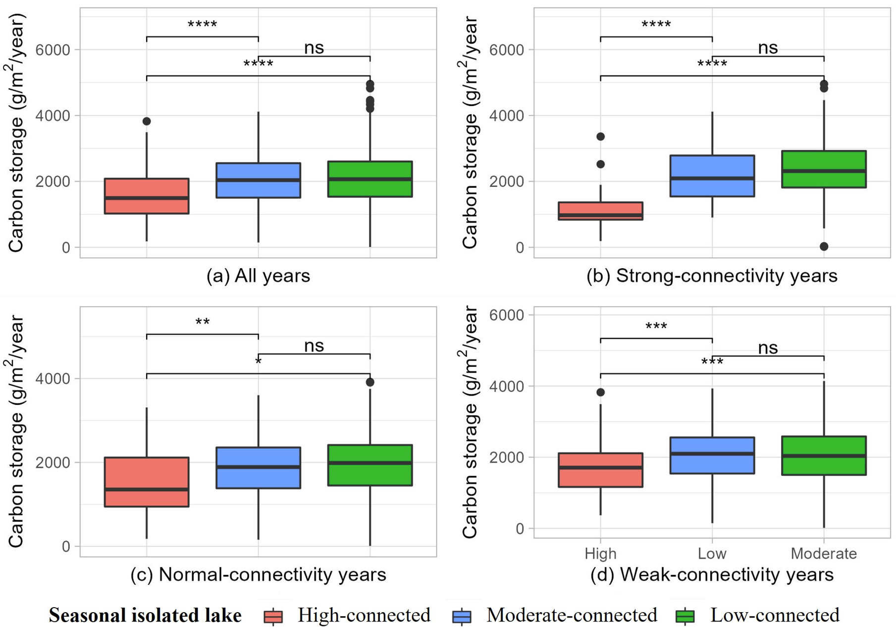 图1. 不同连通性水平下季节性孤立湖泊的碳储量差异