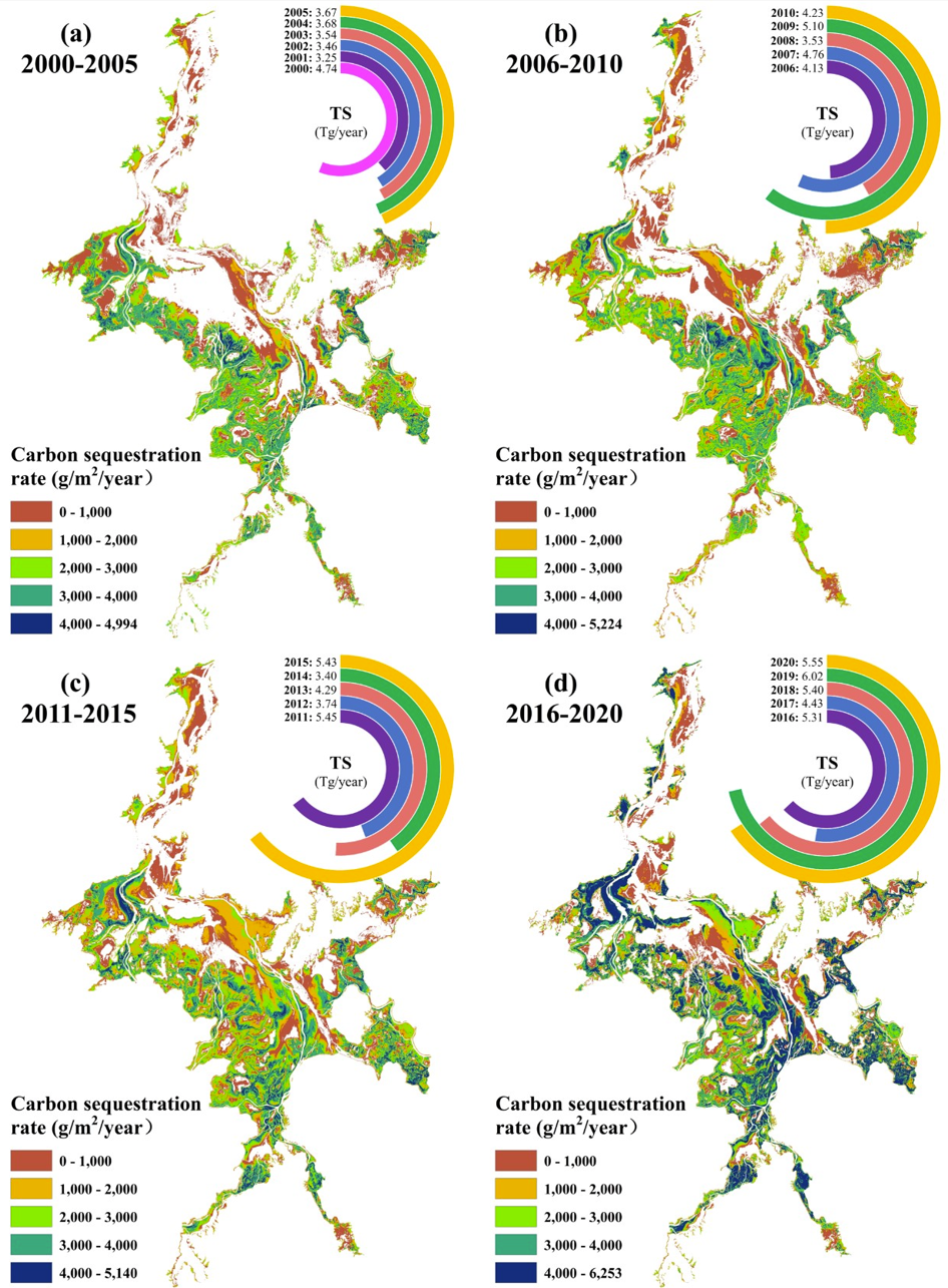 图3. 鄱阳湖湿地植被碳汇速率空间分布与年际变化