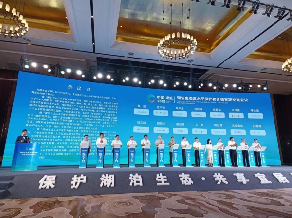微山湖是中国北方最大的淡水湖,是南水北调重要通道和调蓄水库,京杭大运河傍湖而过,水资源、水环境和水生态安全保障十分重要。近年来微山湖实施了退渔、退矿、退光伏等综合治理措施,湖泊生态环境质量持续改善。为更好地解决微山湖在生态、管理和产业高质量发展存在的问题,微山县不断探寻生态保护和高质量发展之路。开幕式上,鄱阳湖、洞庭湖、巢湖、太湖、洪泽湖、骆马湖、瘦西湖、阳澄湖、高邮湖、东平湖、查干湖、千岛湖、呼伦湖、乌梁素海等全国14个重点湖泊管理机构的代表共同签署《湖泊生态高水平保护和价值实现倡议书》,倡议“做湖泊生态高水平保护和价值实现的宣传者、践行者和推动者,携手共创生态文明,同享碧水蓝天,推进湖泊生态高水平保护和高质量发展。”