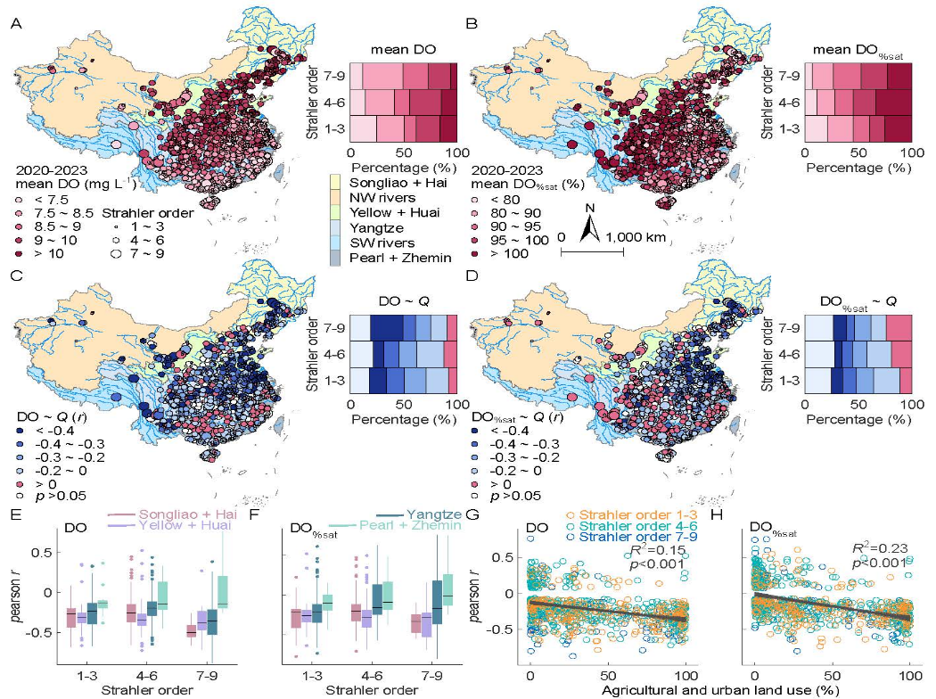 中国河流地表水溶解氧(DO)及其饱和百分比(DO%sat)的全国多年均值,以及河流流量(Q)、DODO%sat之间的关系(成果发表在Nature Communications, https://www.nature.com/articles/s41467-025-62236-5