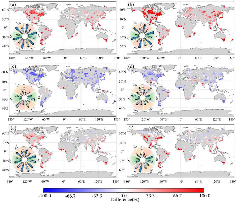 湖泊热浪和大气热浪的年平均热浪指标和差异的全球分布(相关成果发表在Communications Earth & Environment上,https://www.nature.com/articles/s43247-025-02907-9