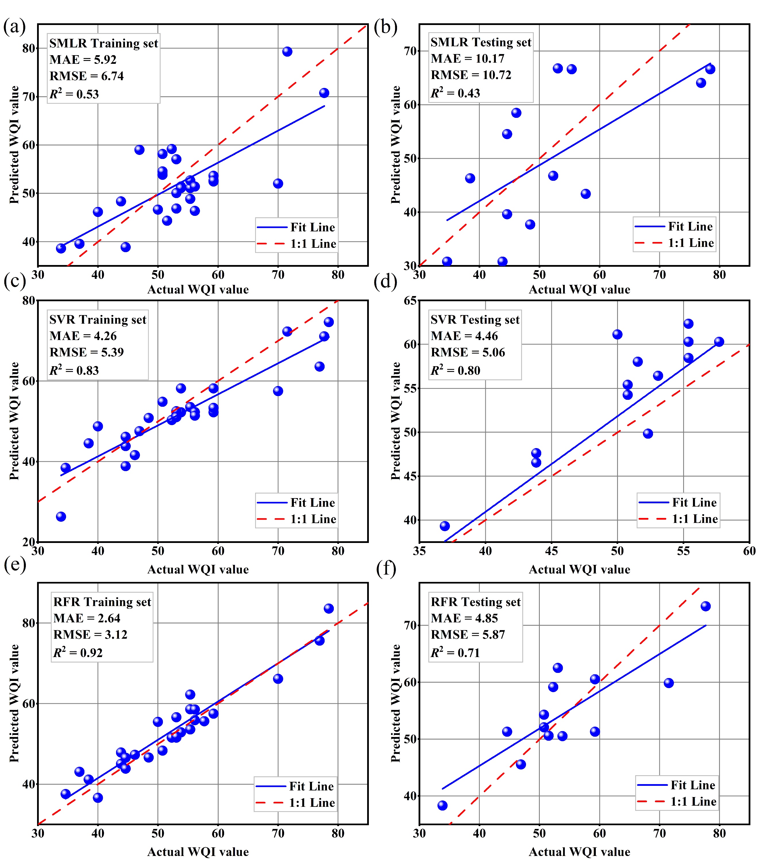 图2. 不同模型对雨季水质预测的拟合散点图
