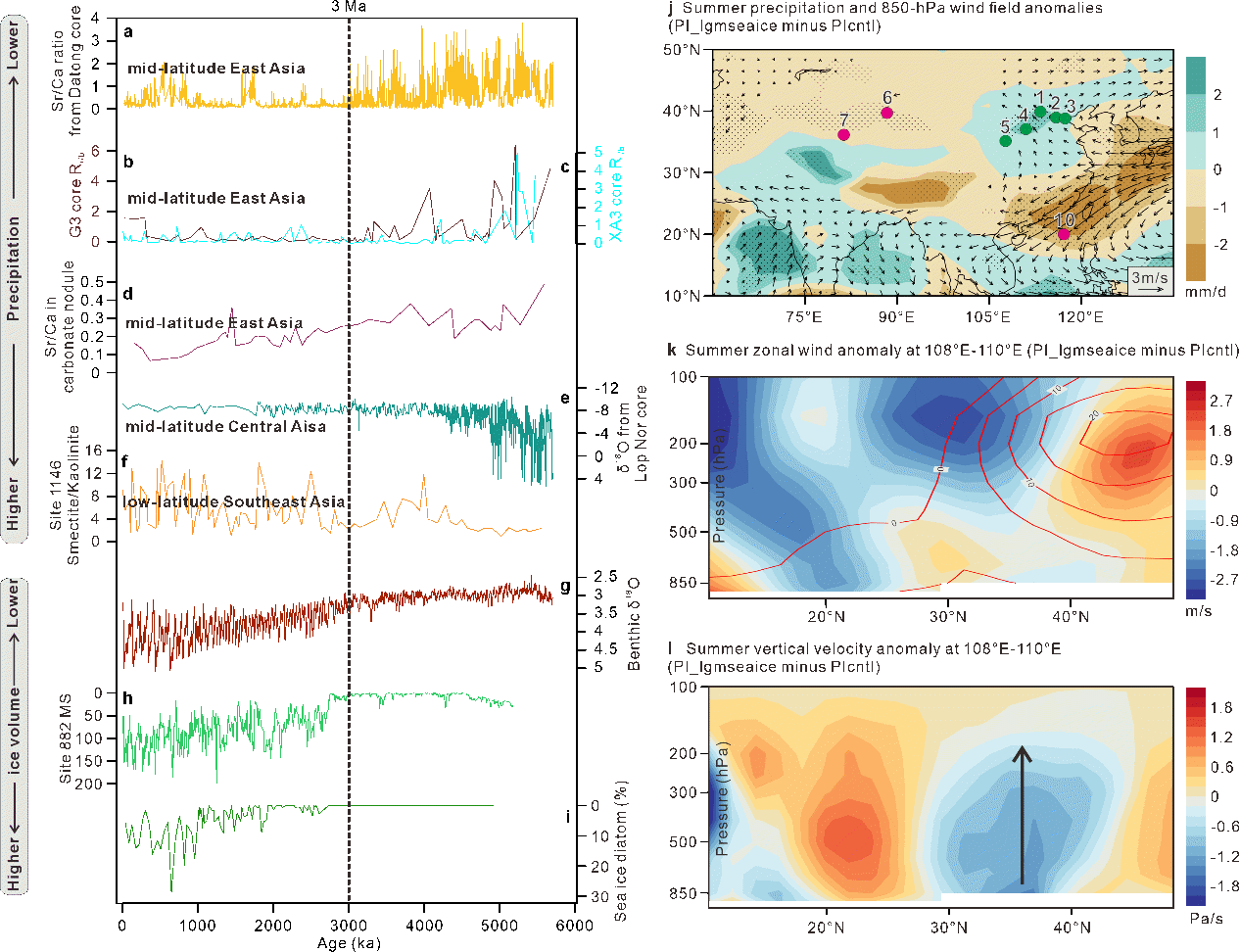 图1. 反映3 Ma前后降水变化的沉积记录及海冰变化敏感性模拟实验