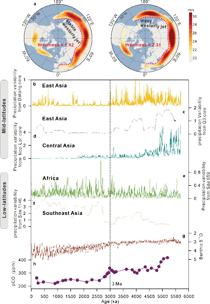 中纬度地区降水变率的下降主要源于西风急流变得更加平直且稳定,这是由冰盖扩张和急流增强共同导致的。相比之下,低纬度地区受西风急流的影响较小,降水变率增大主要响应了3 Ma之后更多变的全球冰量。在全球变暖背景下,随着西风急流蜿蜒性的进一步增强,预计未来中纬度地区极端降水事件将更为频繁。