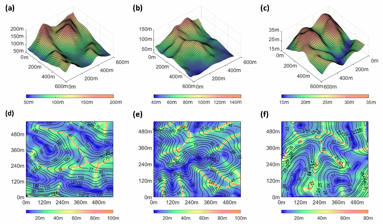 针对上述问题,中国科学院南京地理与湖泊研究所赖锡军研究员团队基于沿流线上比汇水面积(Specific Contributing Area, SCA)与平面曲率之间的本构关系,推导得到了地表任意一点处以平面曲率为变参的一般SCA函数表达式及其数值离散格式;根据网格尺度TCA与点尺度SCA向量之间的数学关系,采用双三次样条函数重构连续的实际地表,构建了内存占用更小、数值精度更高、应用范围更广的TCA数值求解方法—BTN算法。另外,本研究基于简单理论曲面、复杂理论曲面、实际DEM等形态各异的地形表面,设计了3个数值实验,以检验BTN算法的数值计算精度。