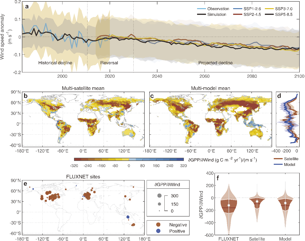 图1. 全球陆地风速变化及生态系统GPP对风速变化的敏感性