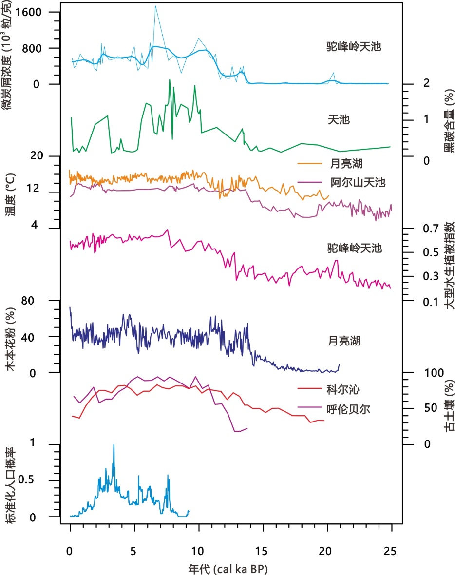 图1 驼峰岭天池微炭屑记录与东北地区主要气候、植被和人类活动等指标对