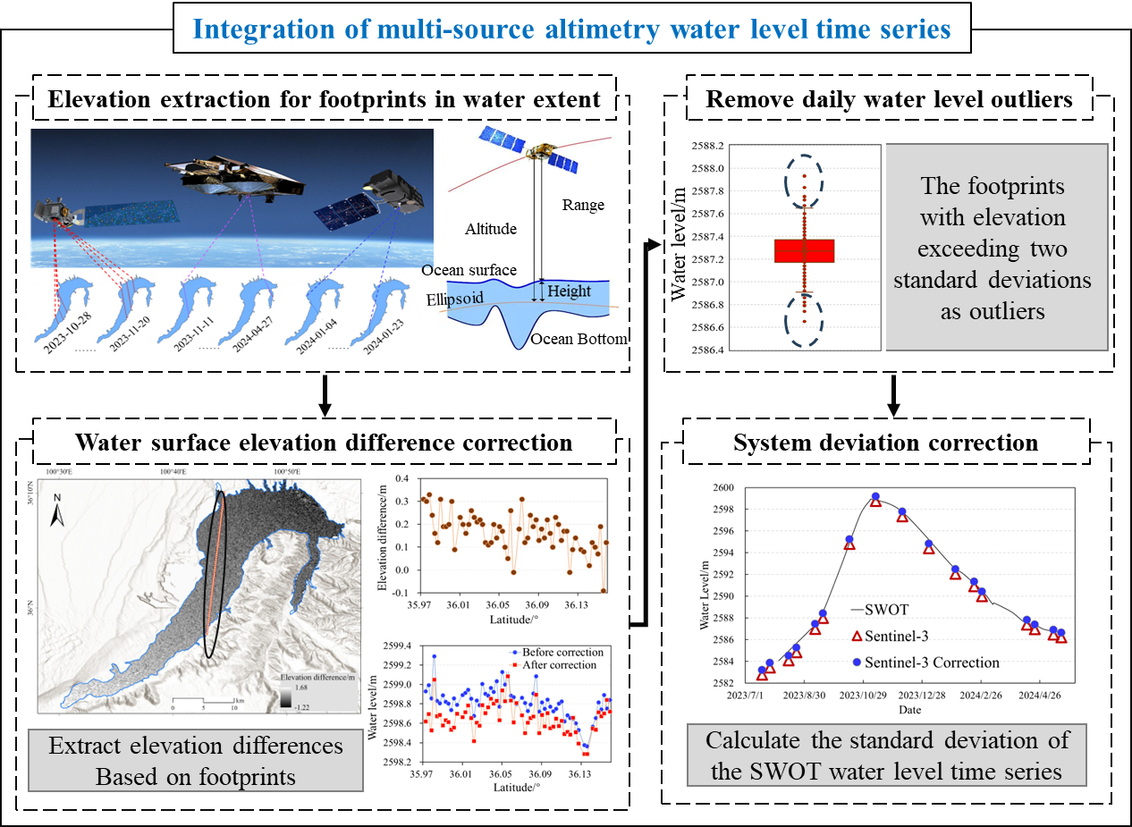由于不同测高卫星在传感器设计、工作波段(激光或微波)、足迹大小及过境位置上(轨道覆盖)存在显著差异,将这些异质数据直接拼接往往会引入巨大的系统性偏差,导致水位时间序列出现失真的突变。针对这一关键难题,研究团队打破了将SWOT仅作为一种新型测高数据的常规思路,创新性地将其确立为校准多源卫星观测的“统一空间基准”。