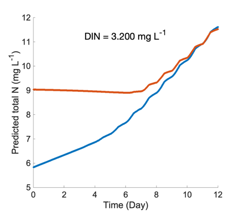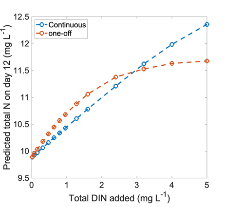 图2. 在相同总氮输入量条件下,连续氮输入(蓝线)与一次性氮输入(红线)